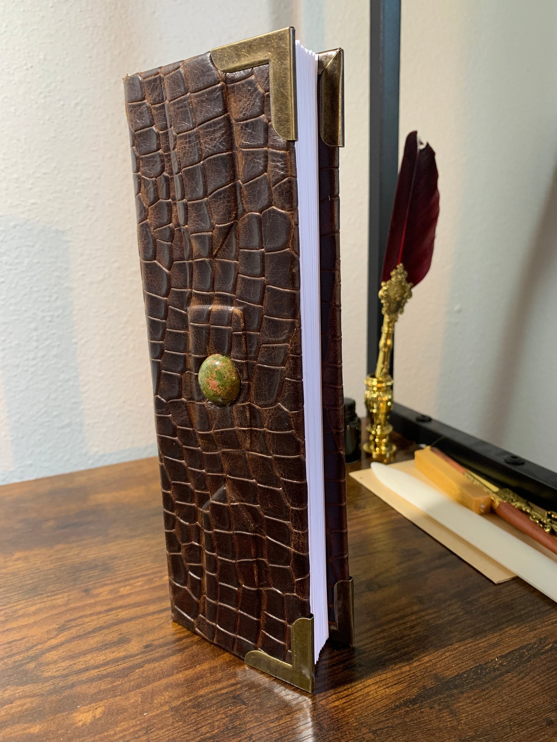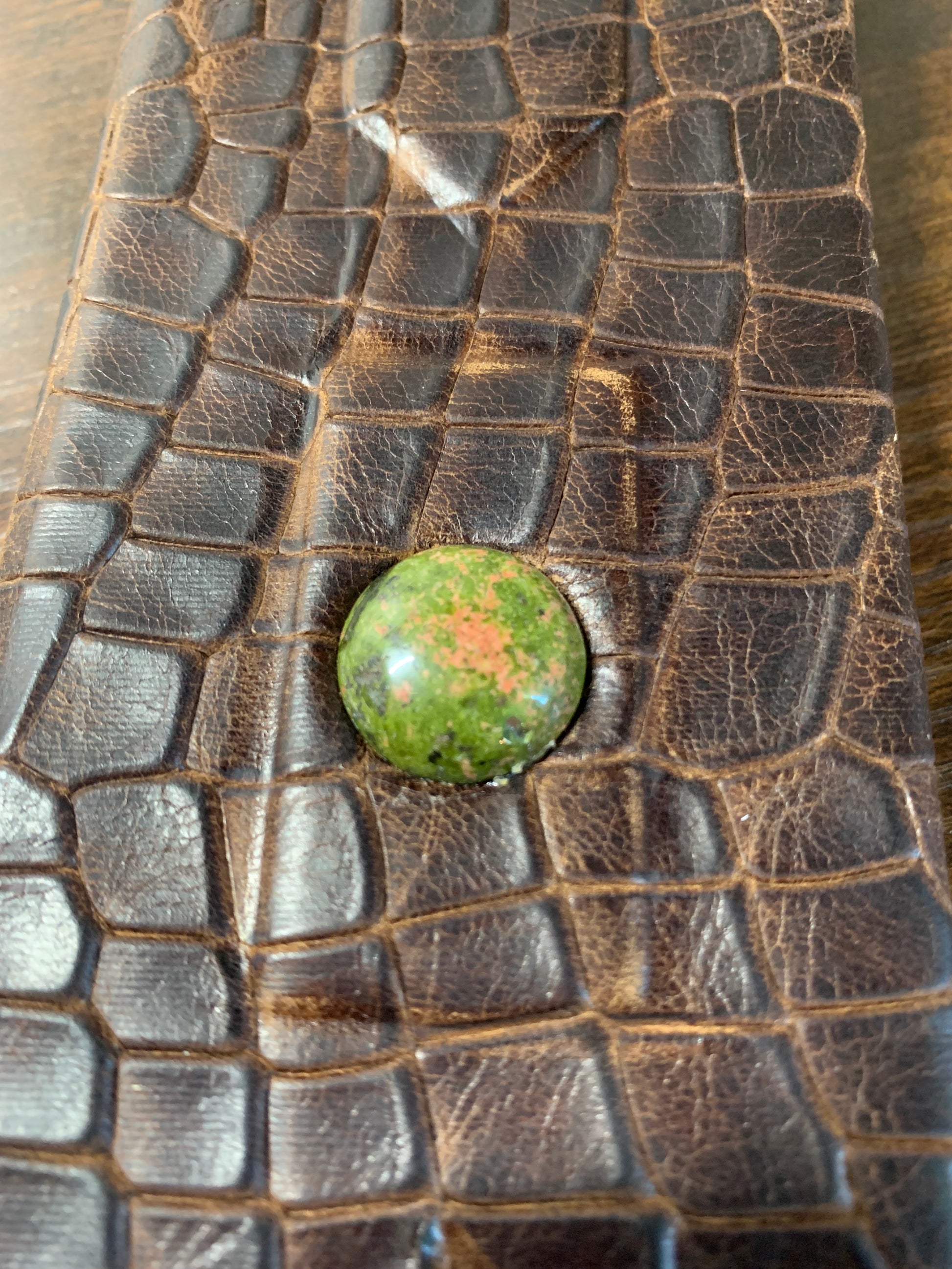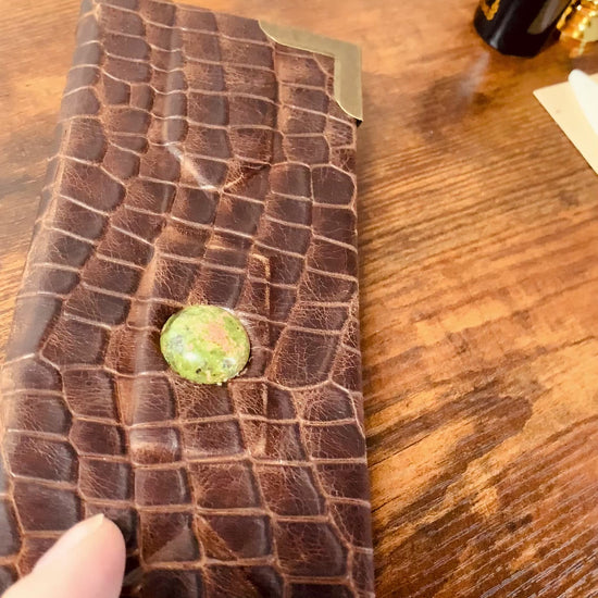 Discover a timeless tool for documenting your valuable vintage finds with the Reptilian Vintage Checklist Booklet. Made with thin yet sturdy watercolor paper and a durable reptile scale embossed leather cover, this 200-page booklet features a green jasper embedded stone and a chain stitched spine. Perfect for any collector, with dimensions of 3 inches x 9 inches and a compact 3/4th inch thickness.