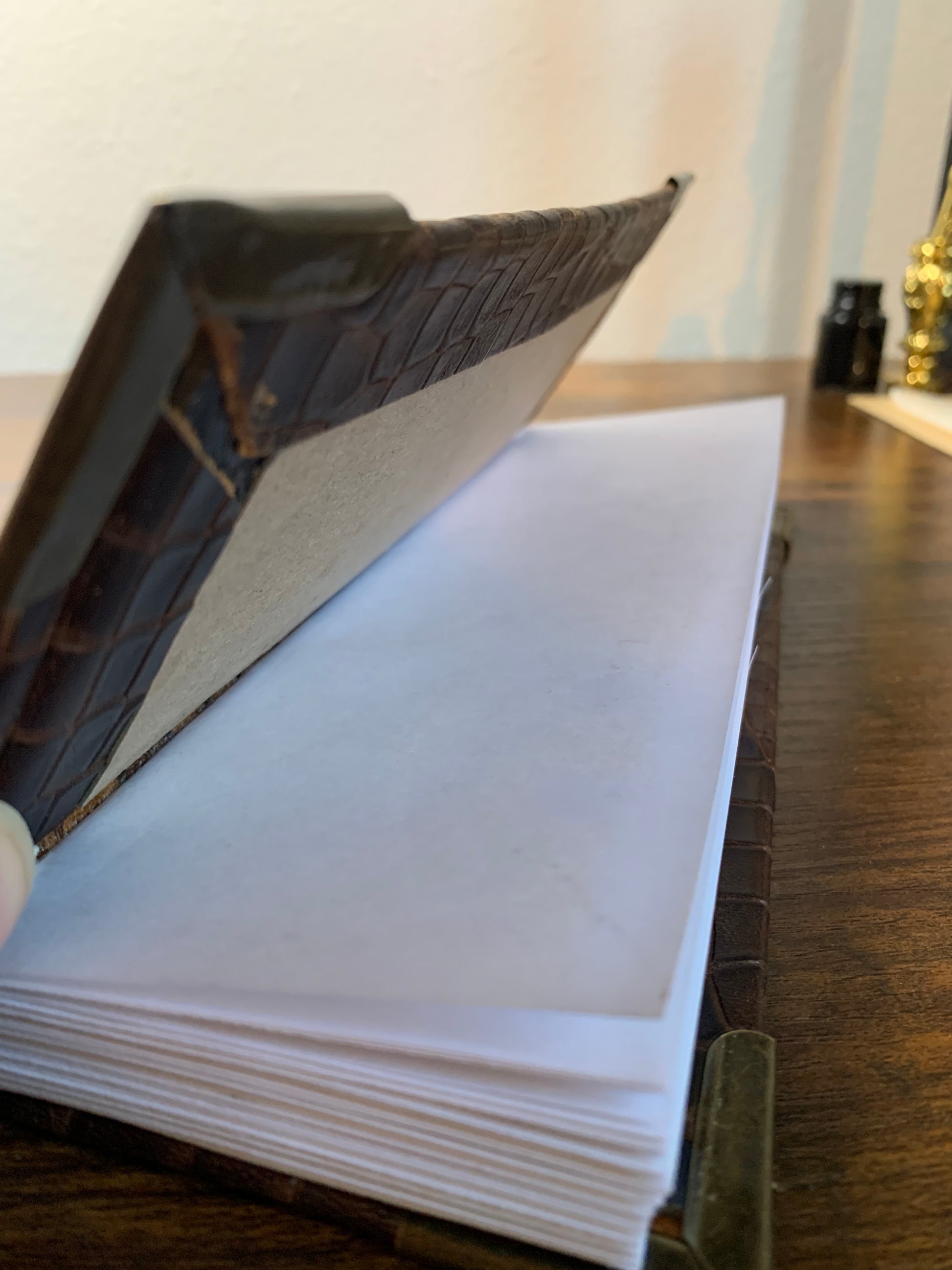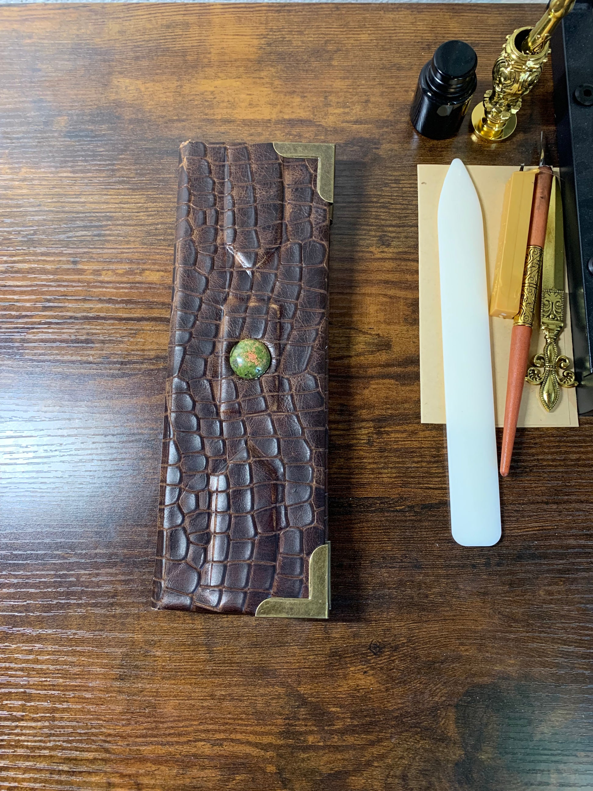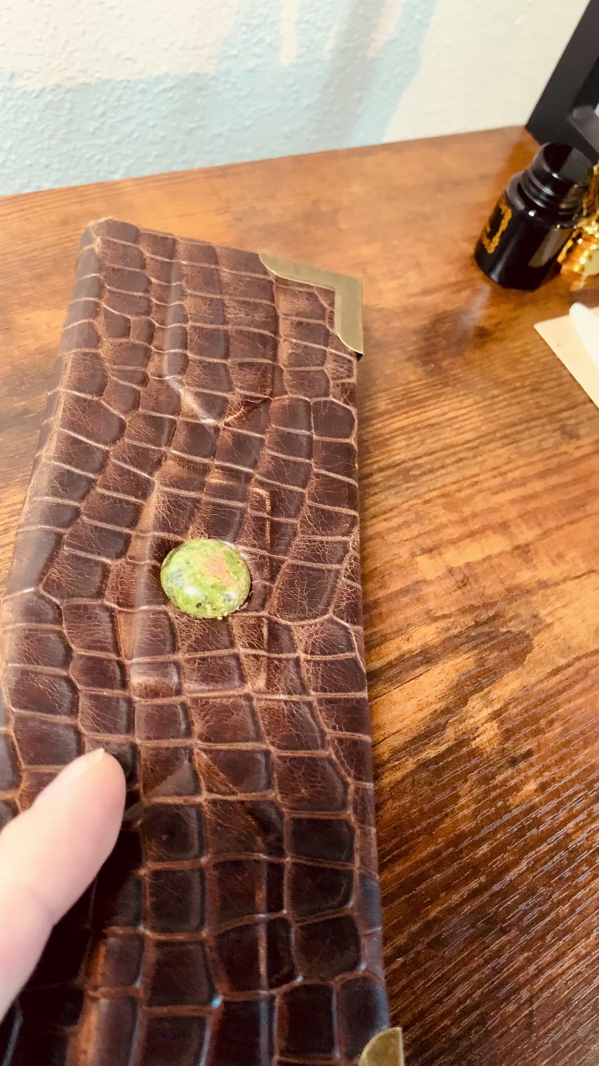 Discover a timeless tool for documenting your valuable vintage finds with the Reptilian Vintage Checklist Booklet. Made with thin yet sturdy watercolor paper and a durable reptile scale embossed leather cover, this 200-page booklet features a green jasper embedded stone and a chain stitched spine. Perfect for any collector, with dimensions of 3 inches x 9 inches and a compact 3/4th inch thickness.