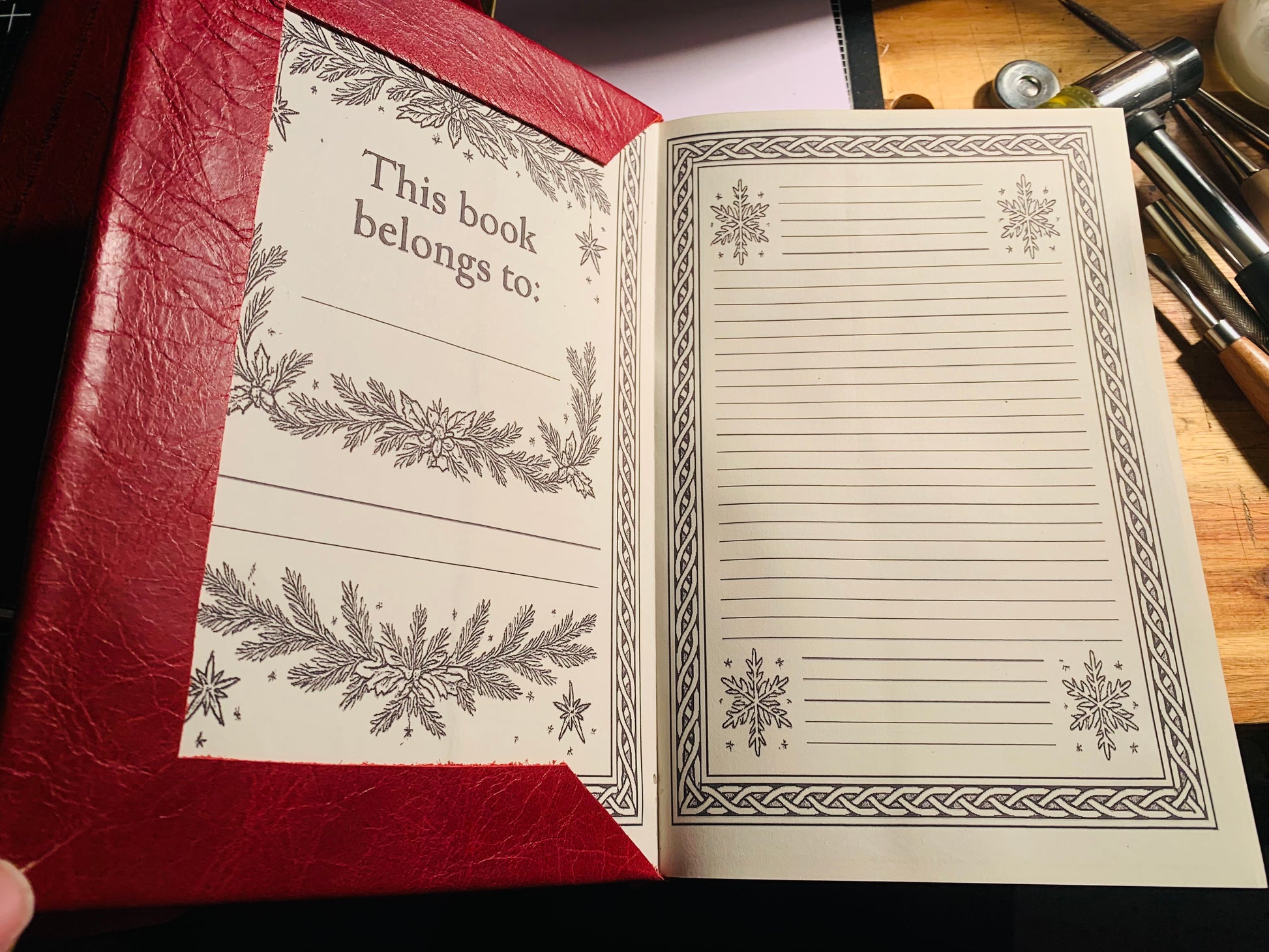 Hand embossed with creativity, page border designs originally designed. This book is one of a kind!