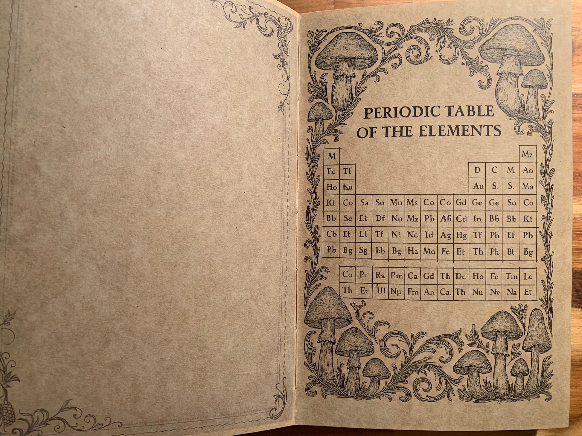A reversible journal; upside down is Mushrooms and right side up is Alchemy. Page border design orientation stays the same.